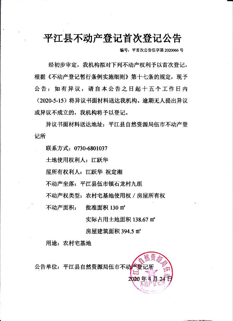 江跃华 祝定湘 不动产首次登记公告伍字第2020066号