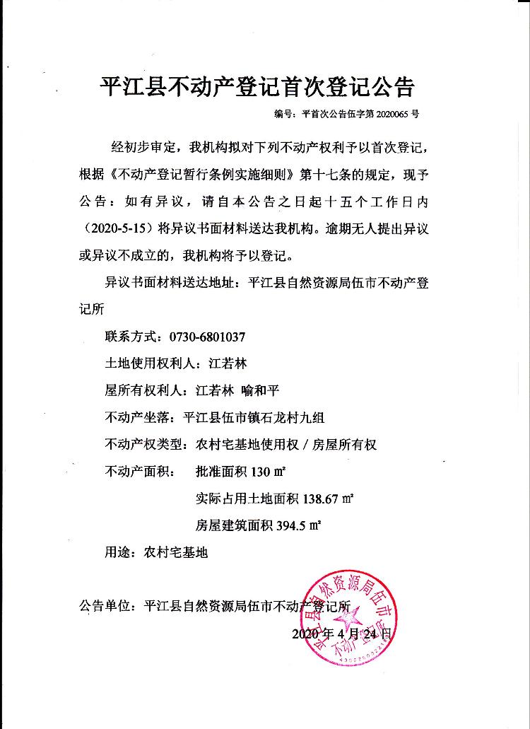 江若林 喻和平 不动产首次登记公告伍字第2020065号