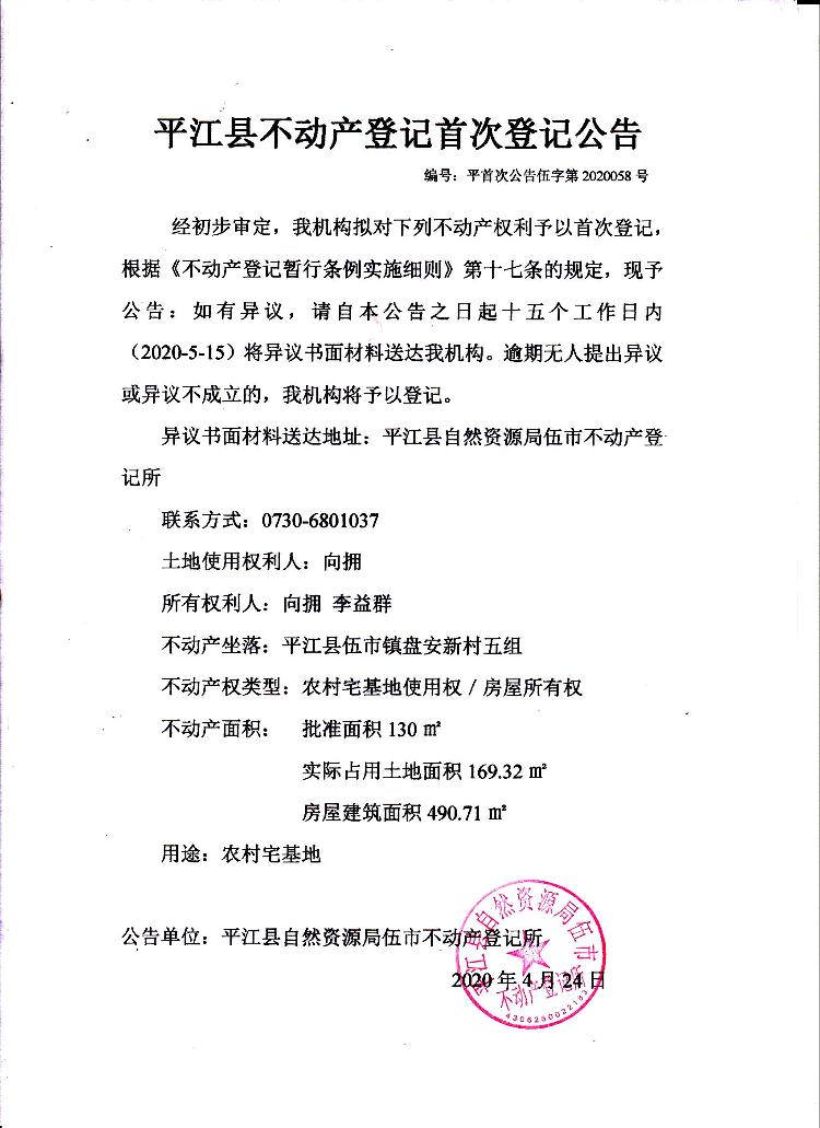 向拥 李益群 不动产首次登记公告伍字第2020058号