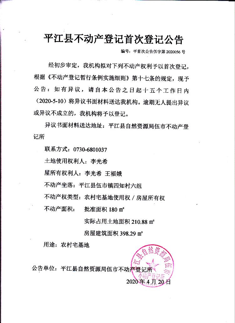 李光希 王福娥不动产首次登记公告伍字第2020056号