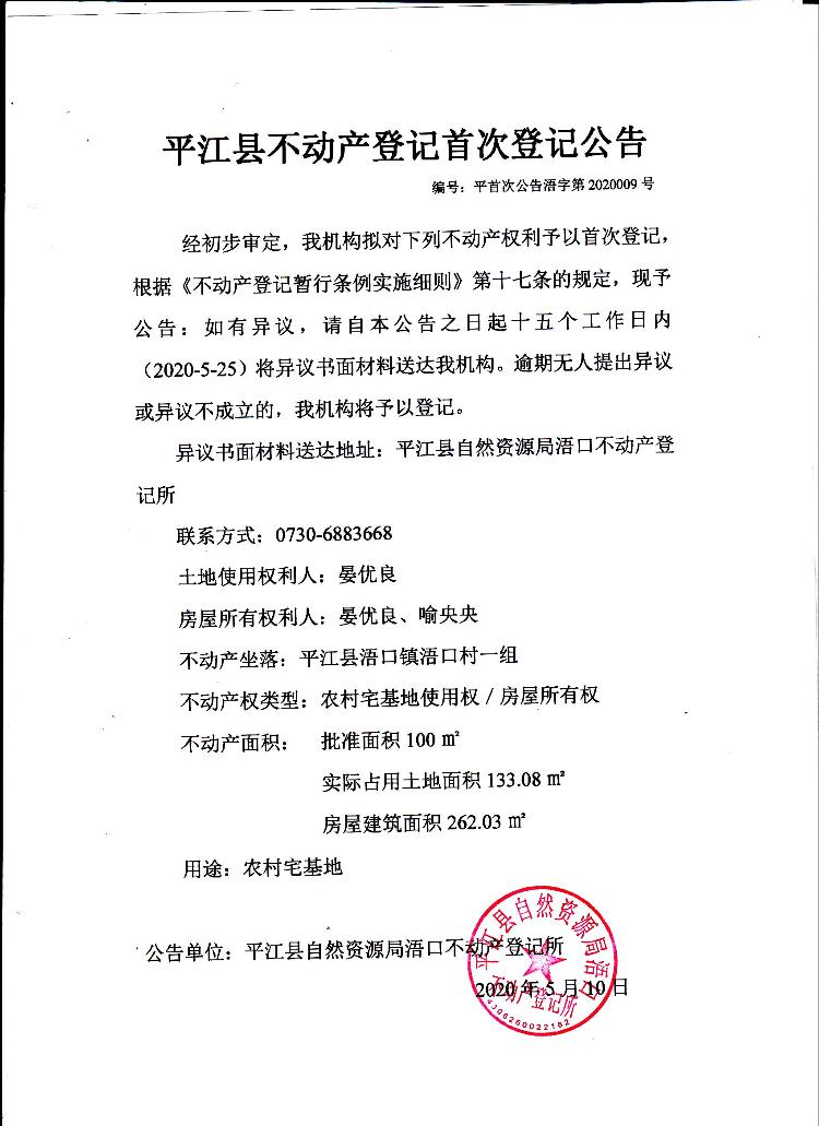晏优良 喻央央 不动产首次登记公告浯字第2020009号