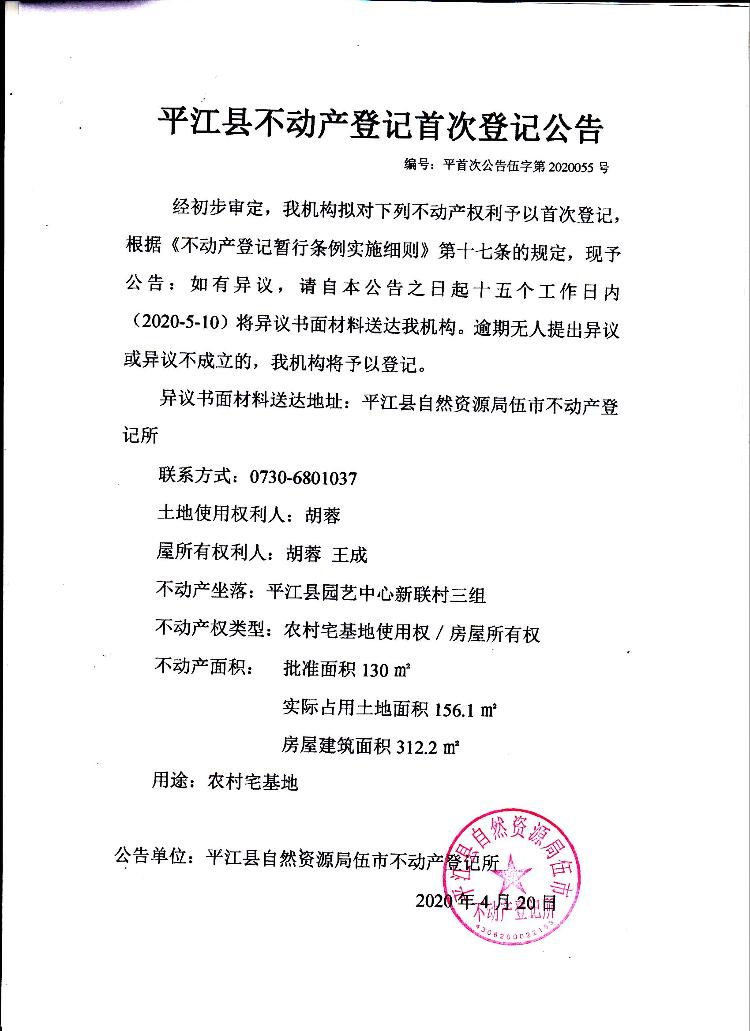 胡蓉 王成 不动产首次登记公告伍字第2020055号