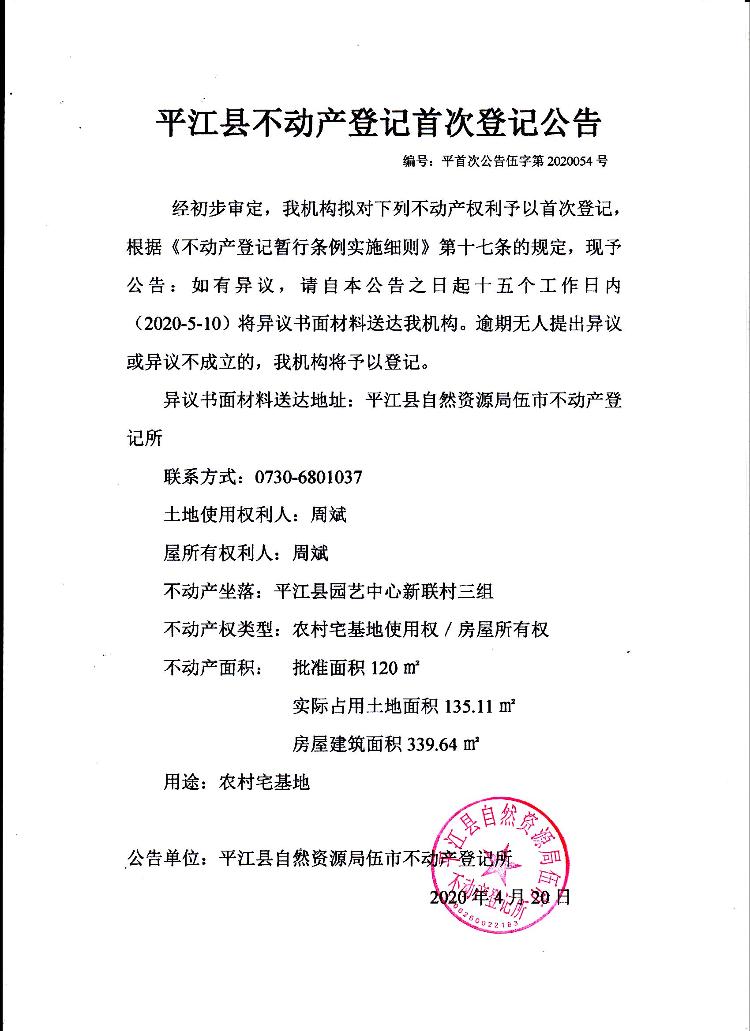 周斌 平江县不动产首次登记公告伍字第2020054号