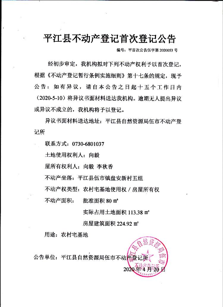 向毅 李秋香 平江县不动产首次登记公告 伍字第2020053号