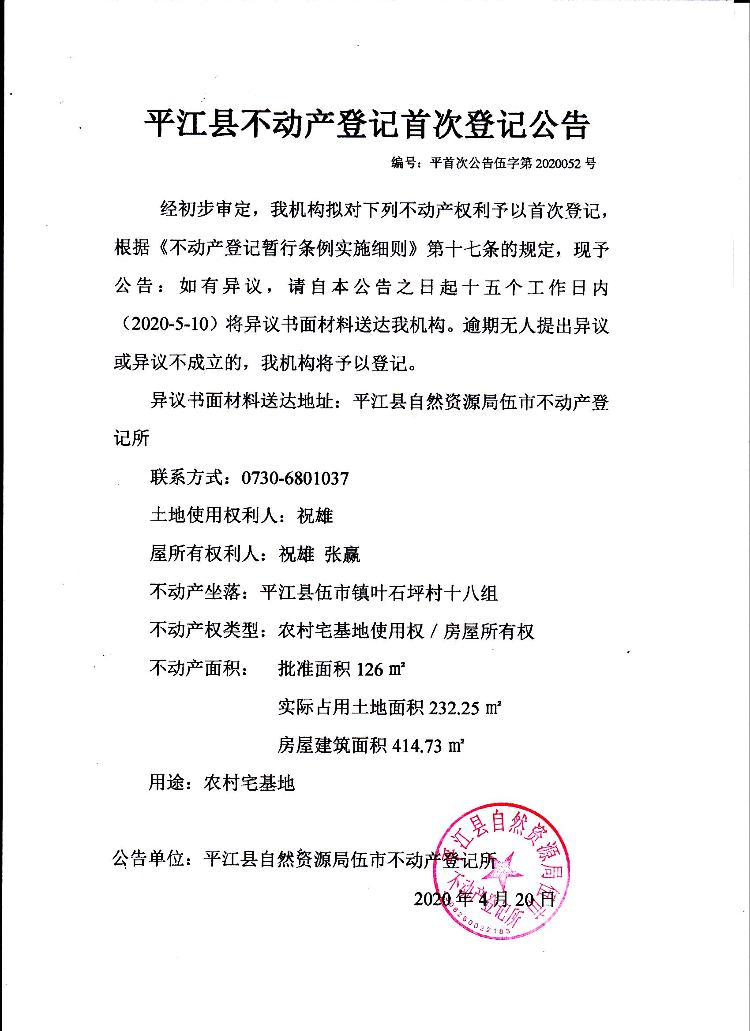 祝雄 张赢 平江县不动产首次登记公告 伍字第2020052号