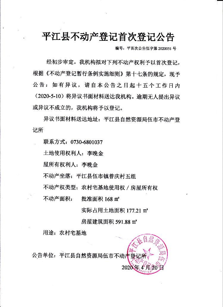 李晚金 平江县不动产首次登记公告伍字第2020051号