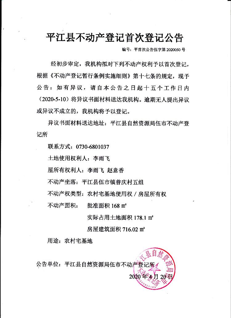 李雨飞 赵意香 不动产首次登记公告 伍字第2020050号