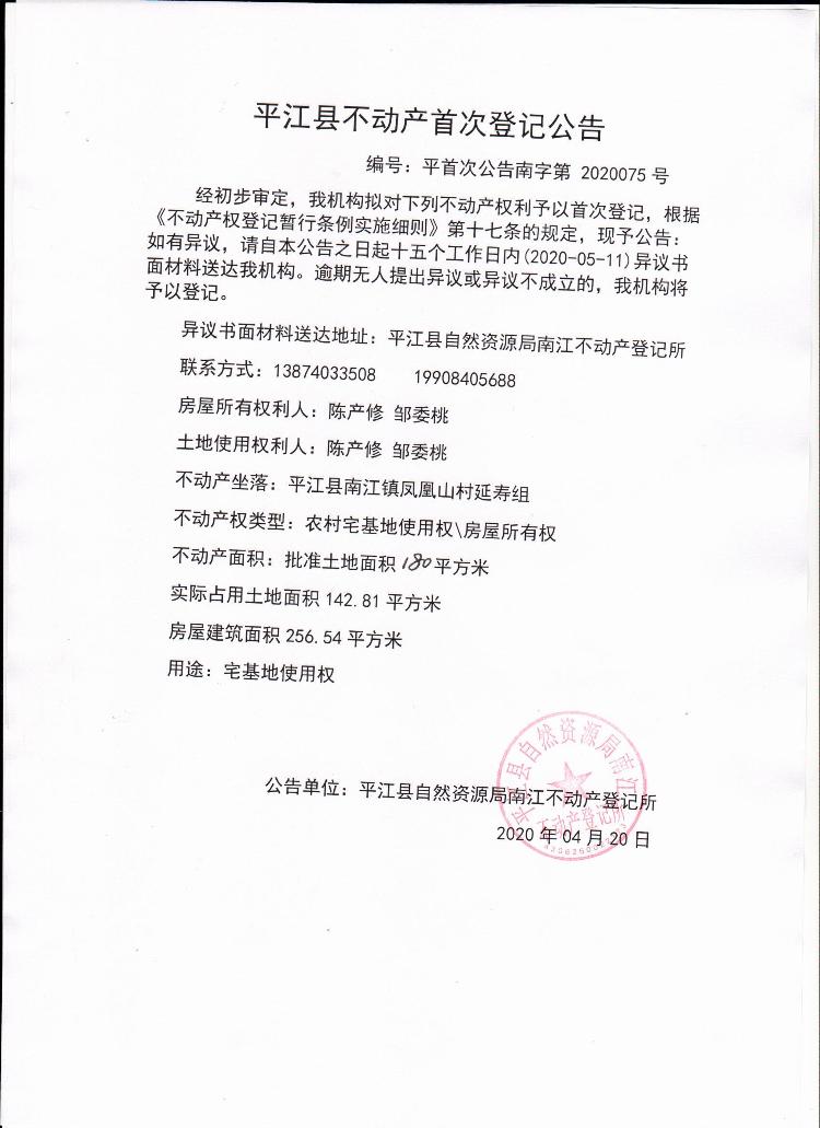 陈产修 邹委桃不动产首次登记公告