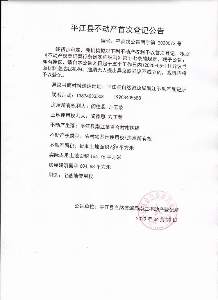 闵德恩 方玉荣不动产首次登记公告