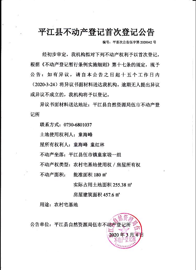 童海峰 童红林 不动产首次登记公告伍字第2020042号