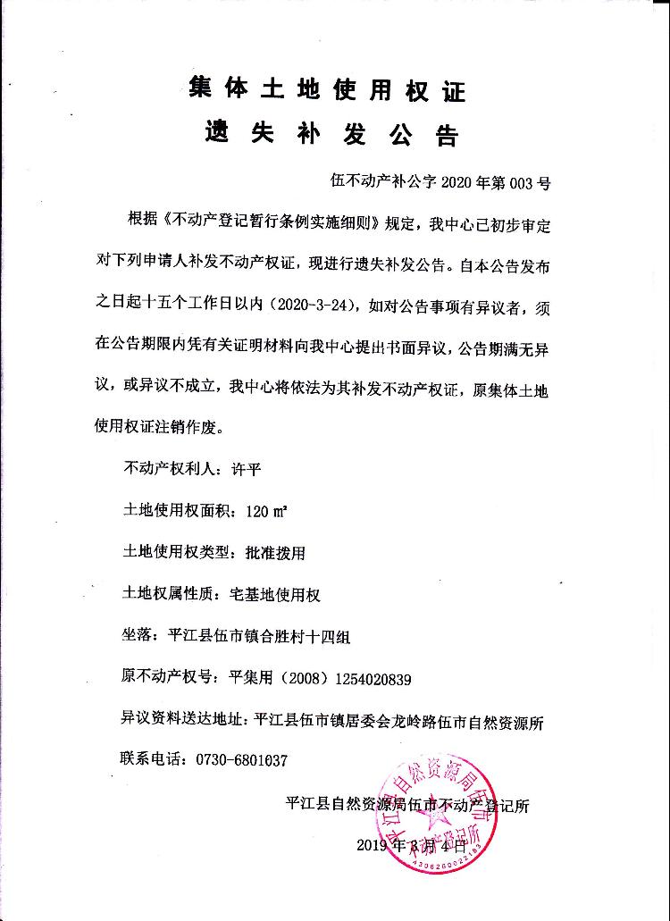 许平 集体土地使用权证 遗失补发公告 伍不动产补公字2020003号