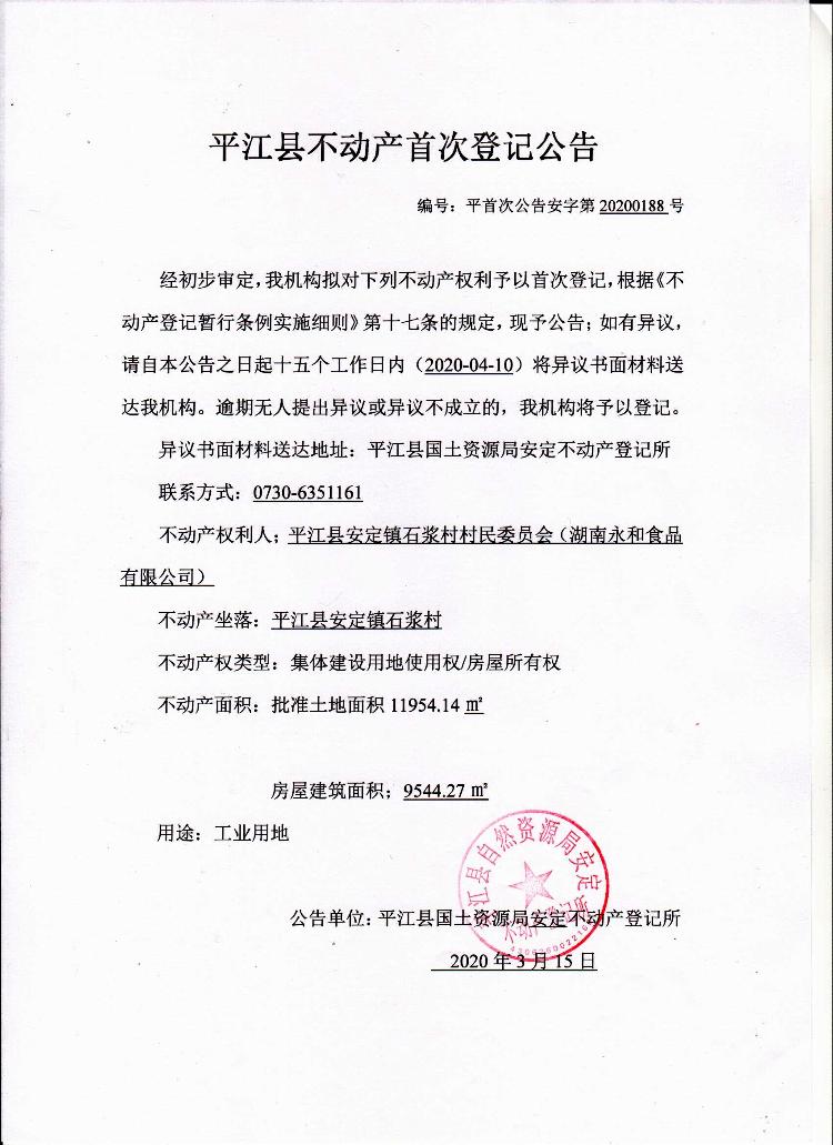 平江县安定镇石浆村村民委员会(湖南永和食品有限公司)不动产首次登记公告