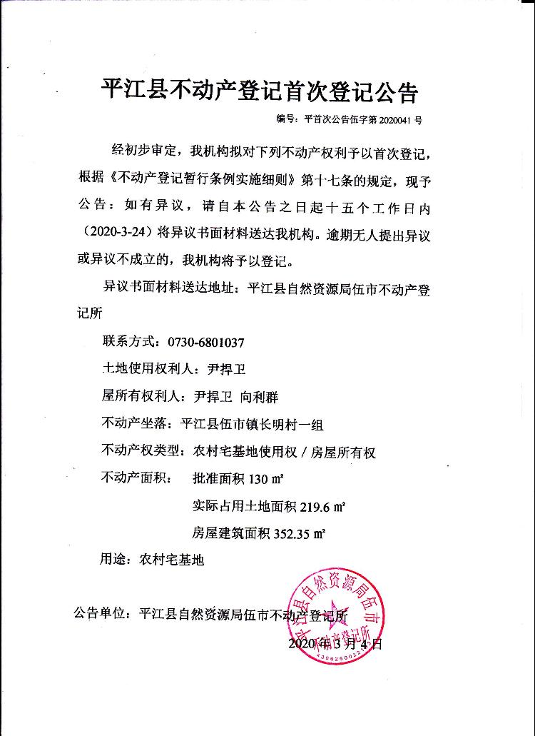 尹捍卫 向利群 不动产首次登记公告伍字第2020041号