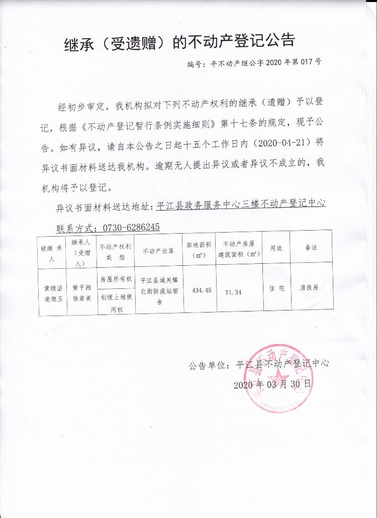 黄干湘 徐若美继承(受遗赠)的不动产登记公告