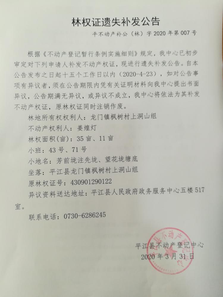 姜煌灯林权证遗失补发公告