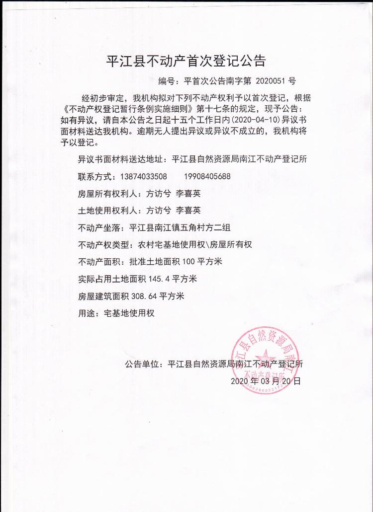 方访兮 李喜英不动产首次登记公告