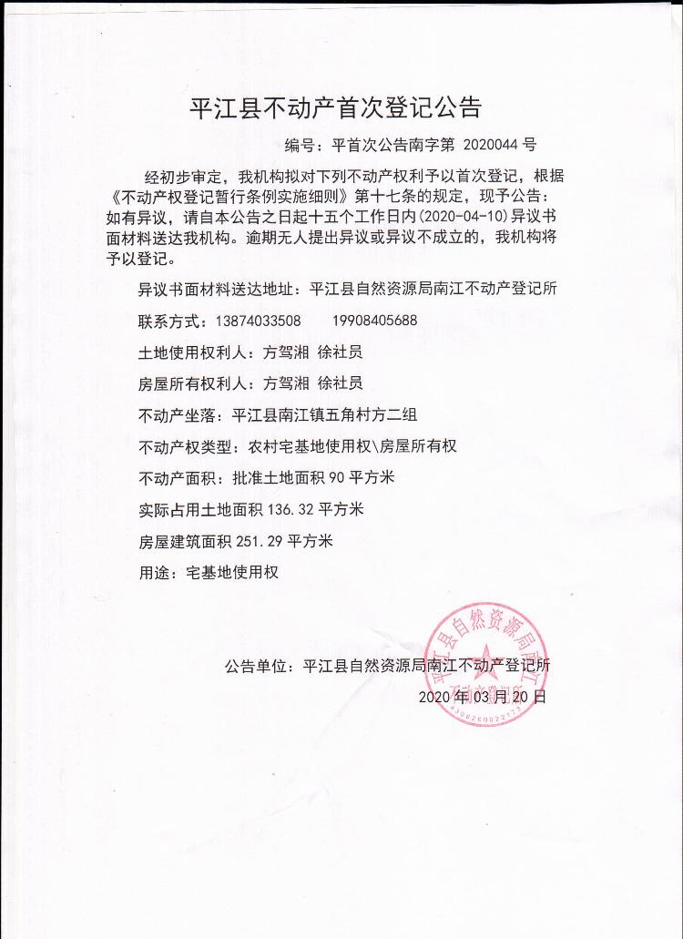 方驾湘 徐社员不动产首次登记公告