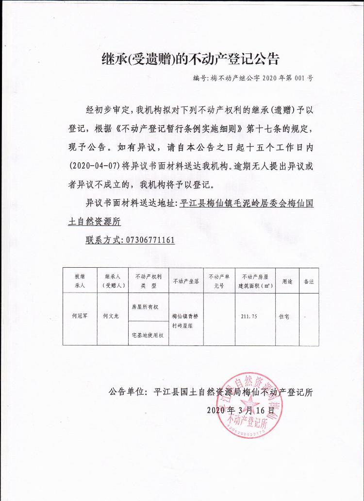 何文龙 彭河花继承(受遗赠)的不动产登记公告