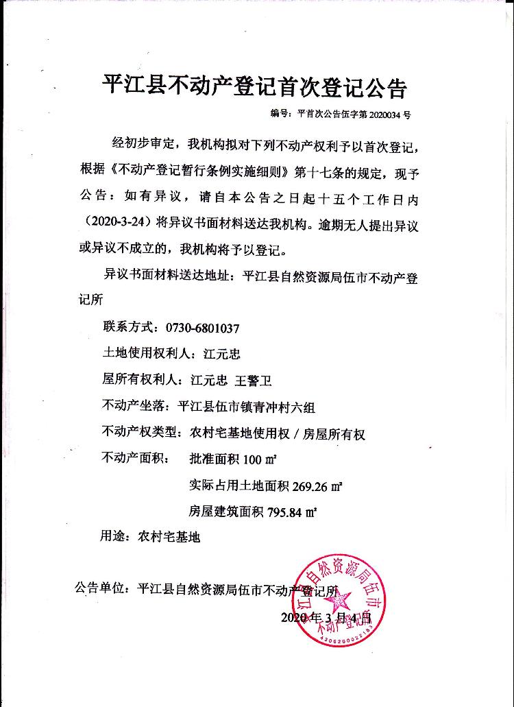江元忠 王警卫 平江县不动产首次登记公告 伍字第202034号