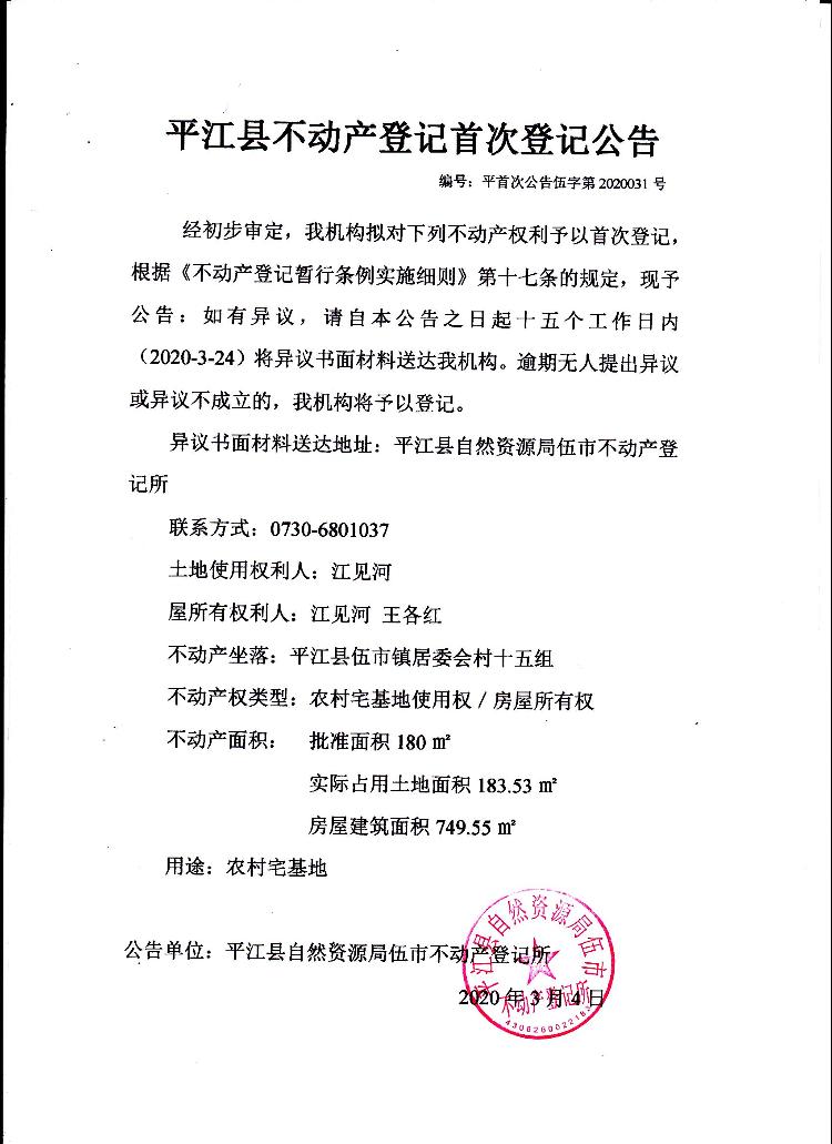 江见河 王各红 平江县不动产首次登记公告伍字第2020031号
