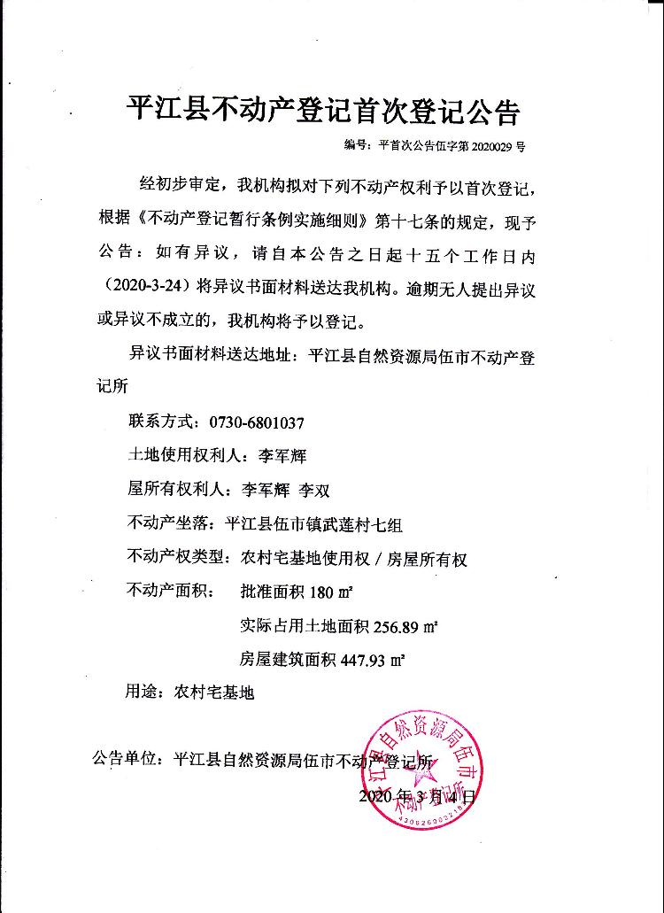 李军辉 李双 平江县不动产首次登记公告 伍字第2020029号