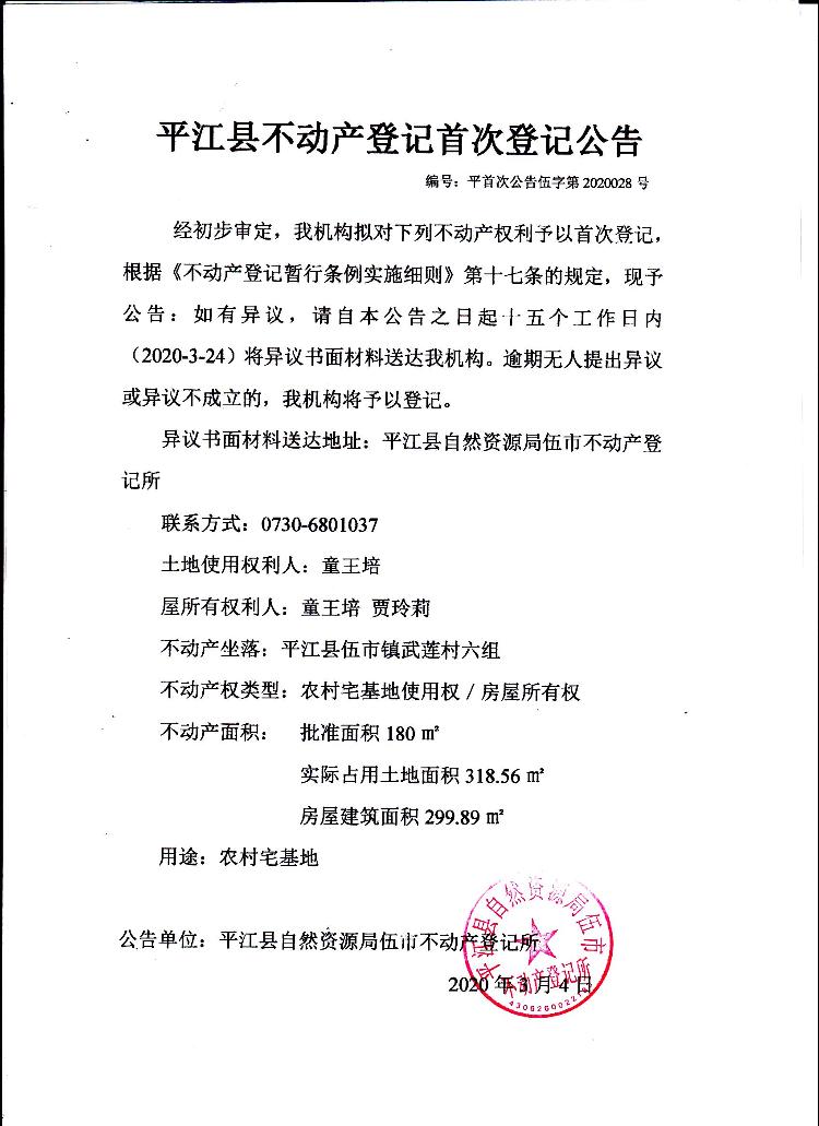 童王培 贾玲莉 平江县不动产首次登记公告 伍字第2020028号