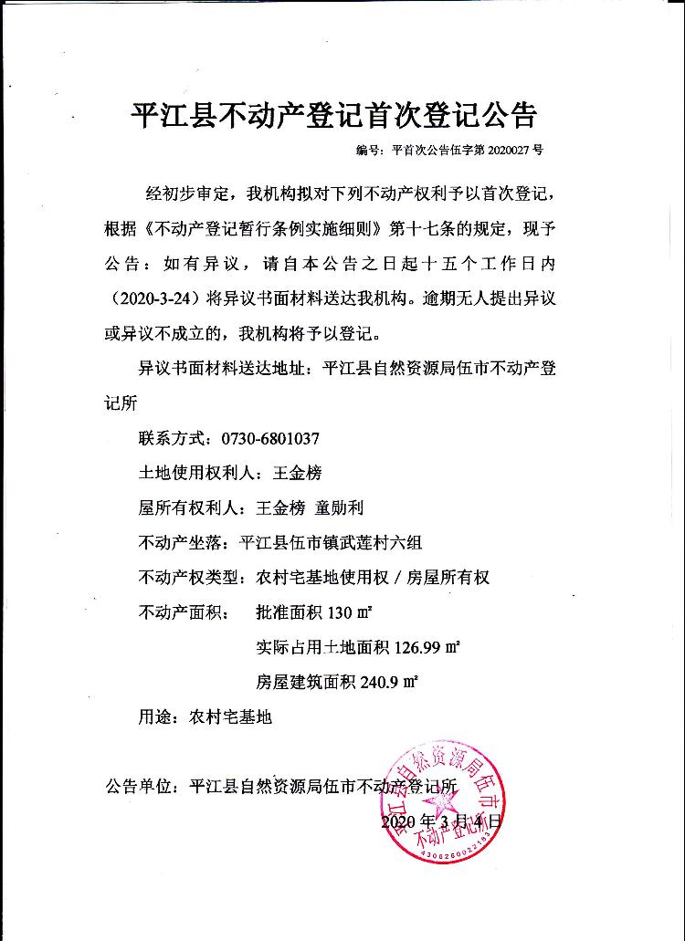 王金榜 童勋利 平江县不动产首次登记公告 伍字第2020027号