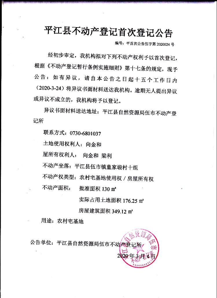 向金和 梁利 平江县不动产首次登记公告 伍字第2020024号