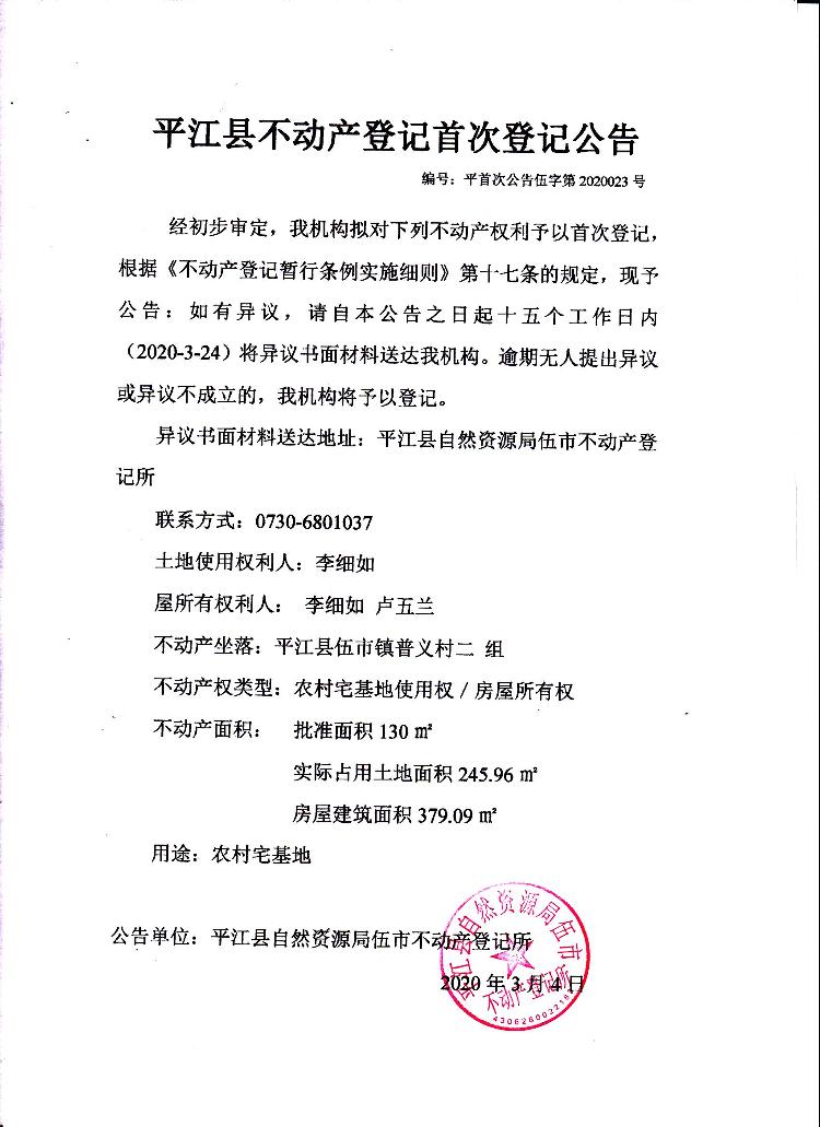 李细如 卢五兰 平江县不动产首次登记公告 伍字第2020023号