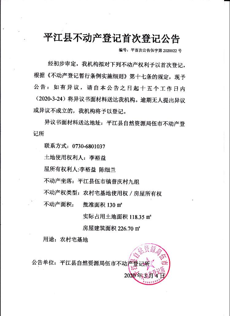 李裕益 陈细兰 平江县不动产首次登记公告伍字第2020022号
