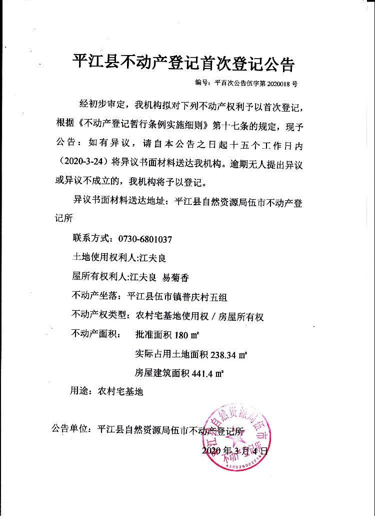 江夫良 易菊香 平江县不动产首次登记公告伍字第2020018号