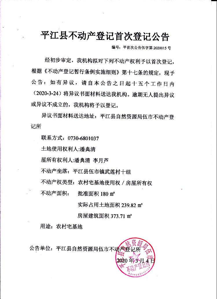 潘典清 李月芦 平江县不动产首次登记公告 伍字第2020015号