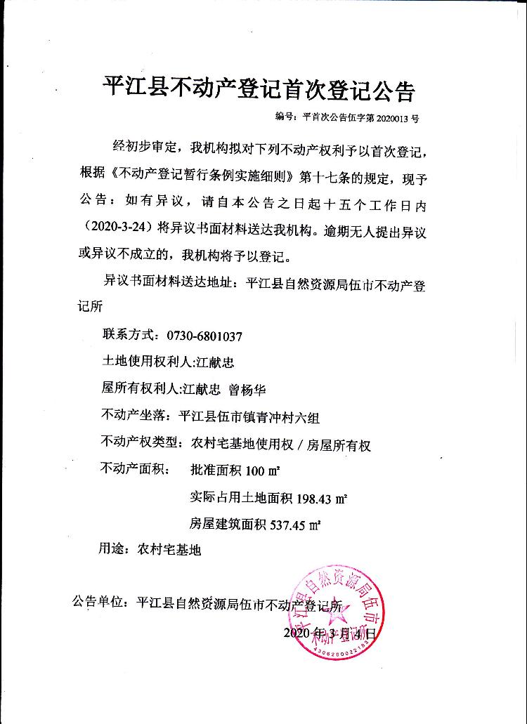 江献忠 曾杨华 平江县不动产首次登记公告 伍字第2020013号