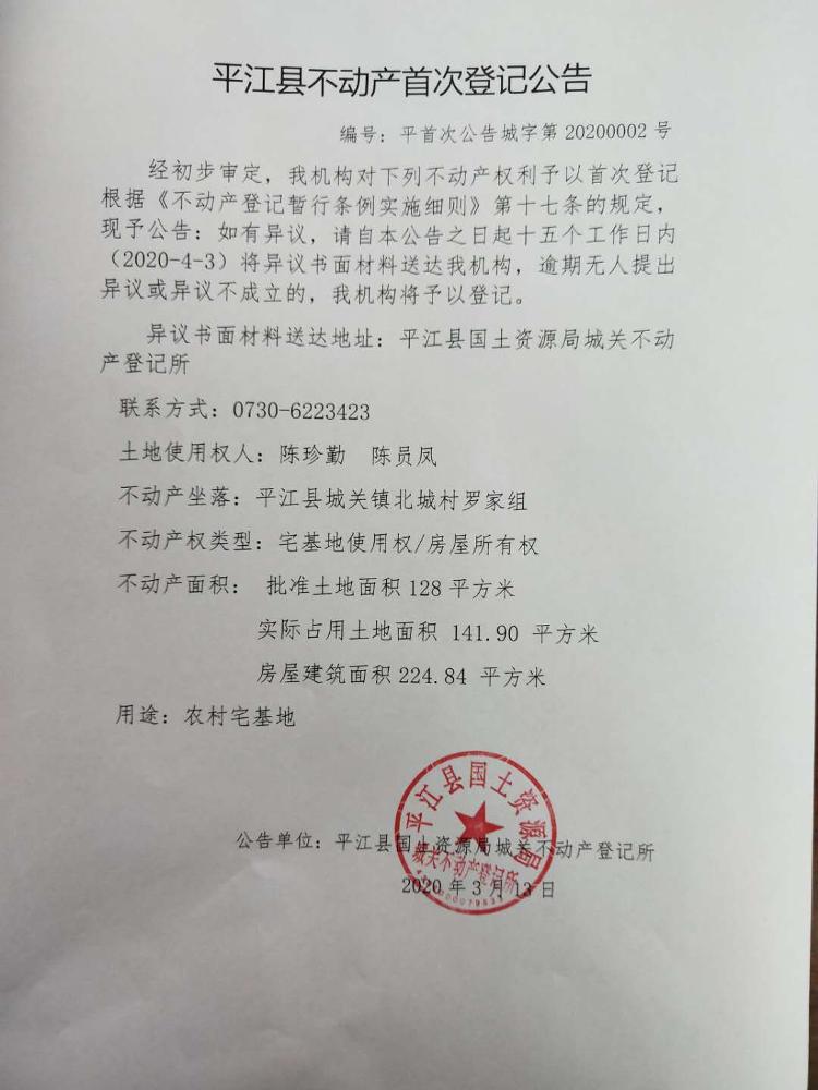 陈珍勤 陈员凤不动产首次登记公告