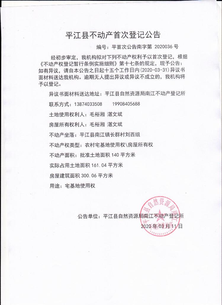 毛裕湘 湛文斌平江县不动产首次登记公告