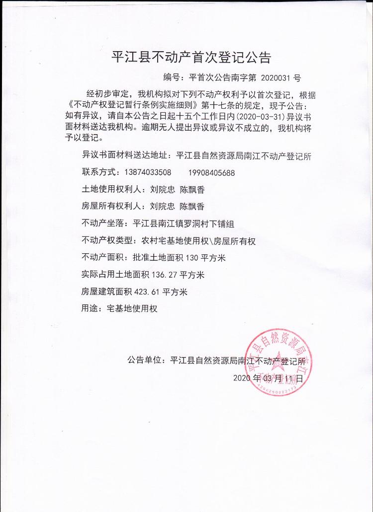 刘院忠 陈飘香平江县不动产首次登记公告