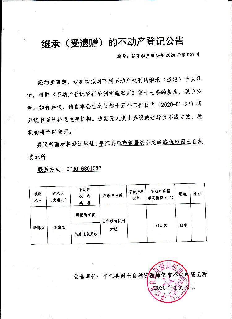 李稳根 继承(受遗赠)的不动产登记公告 伍继公字2020年第001号