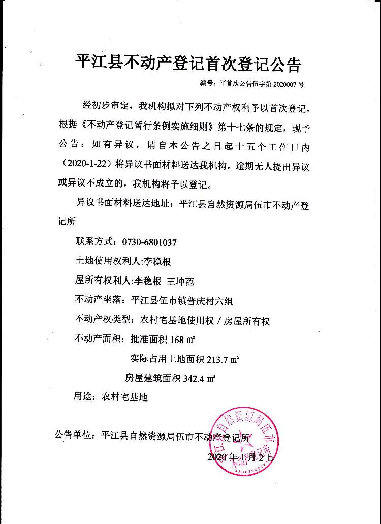 李稳根 王坤范 平江县不动产首次登记公告 伍字第2020007号