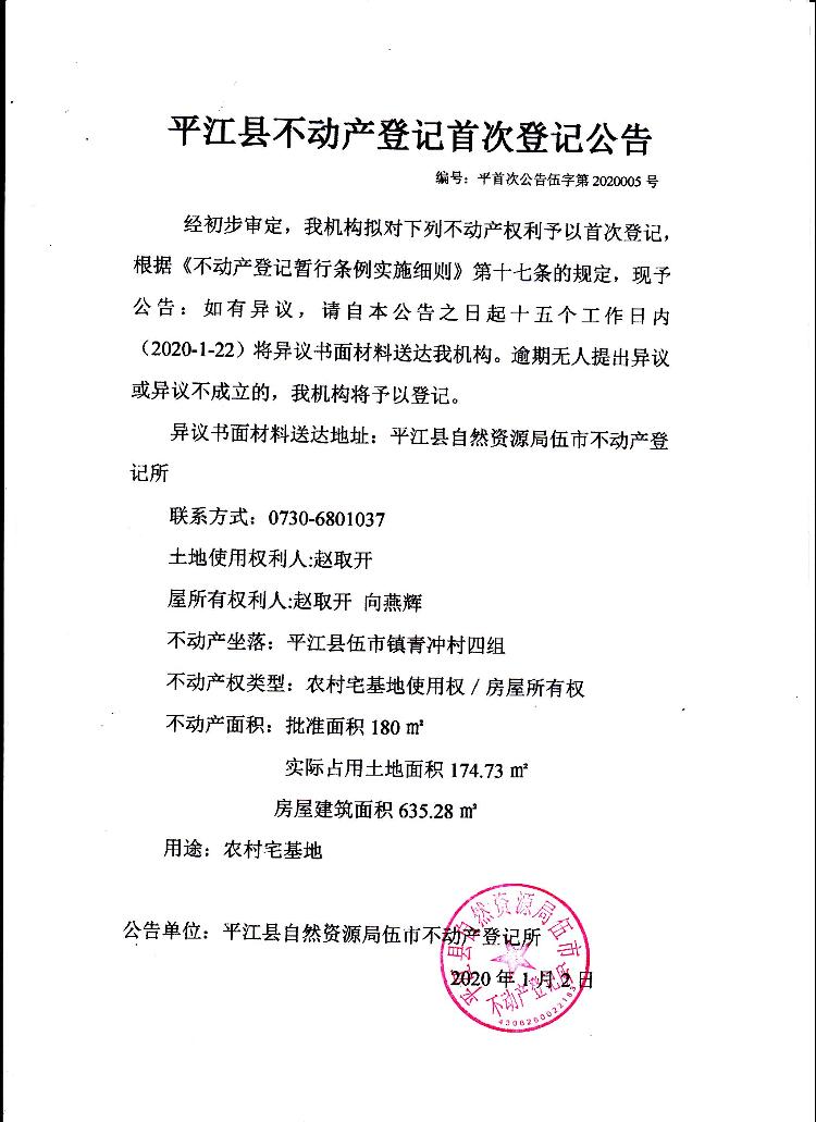赵取开 向燕辉 平江县不动产首次登记公告 伍字第2020005号