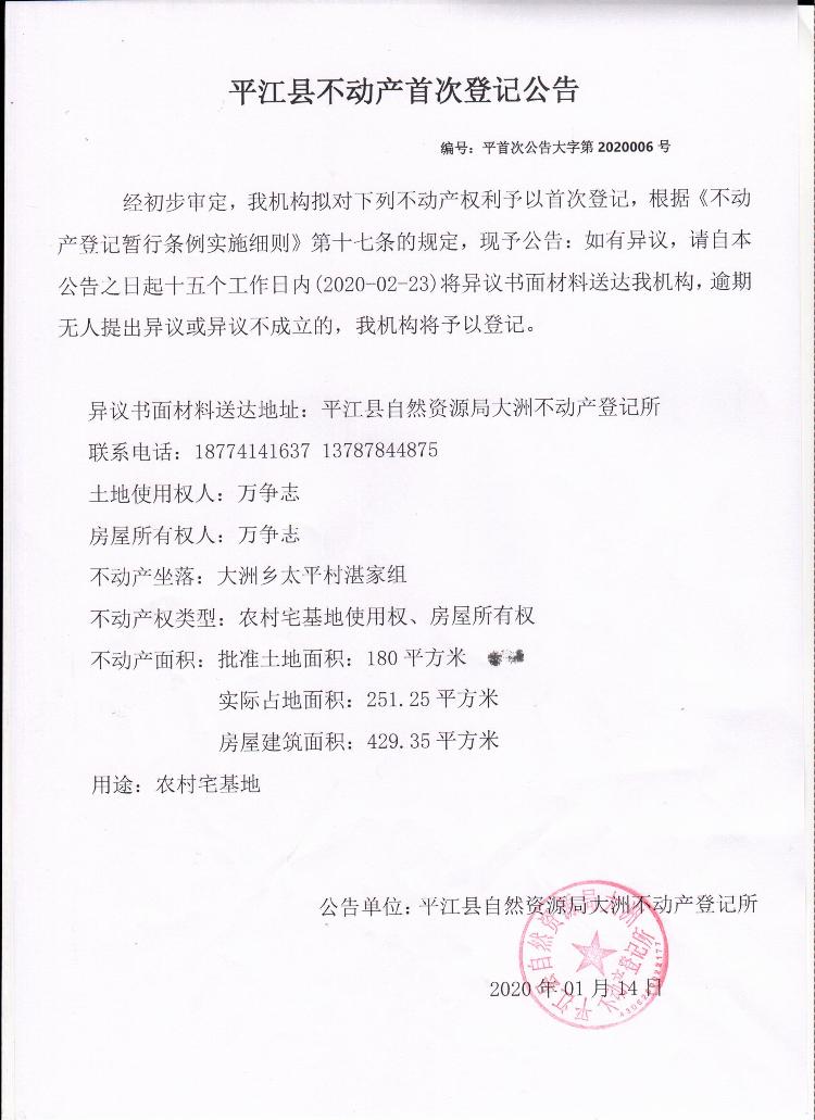 万争志平江县不动产首次登记公告