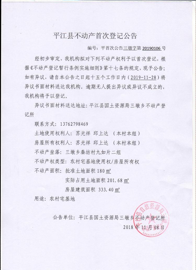 平首次公告三墩字第2019106号苏光祥 邱小达