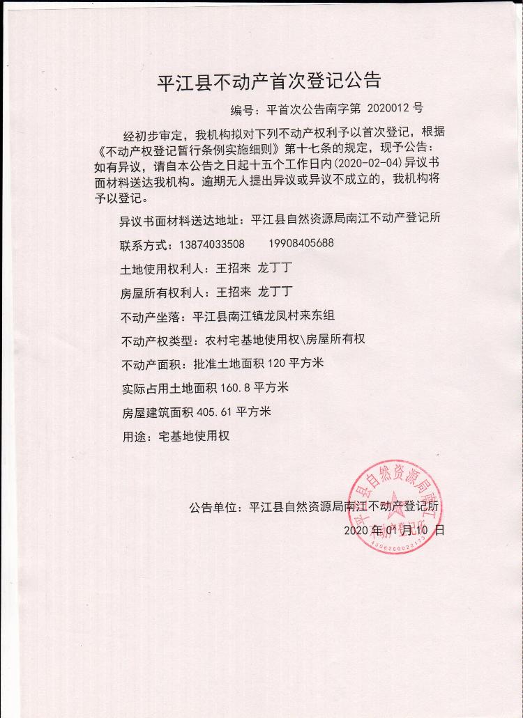 王招来 龙丁丁不动产首次登记公告