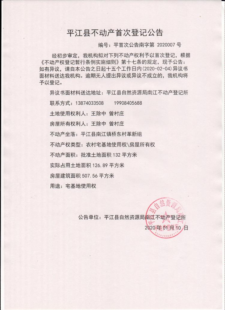 王除中 曾村庄不动产首次登记公告