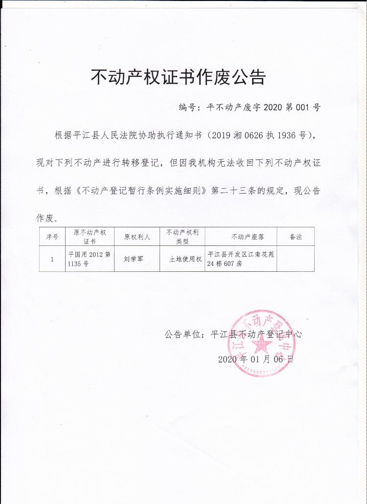 刘学军不动产权证书作废公告