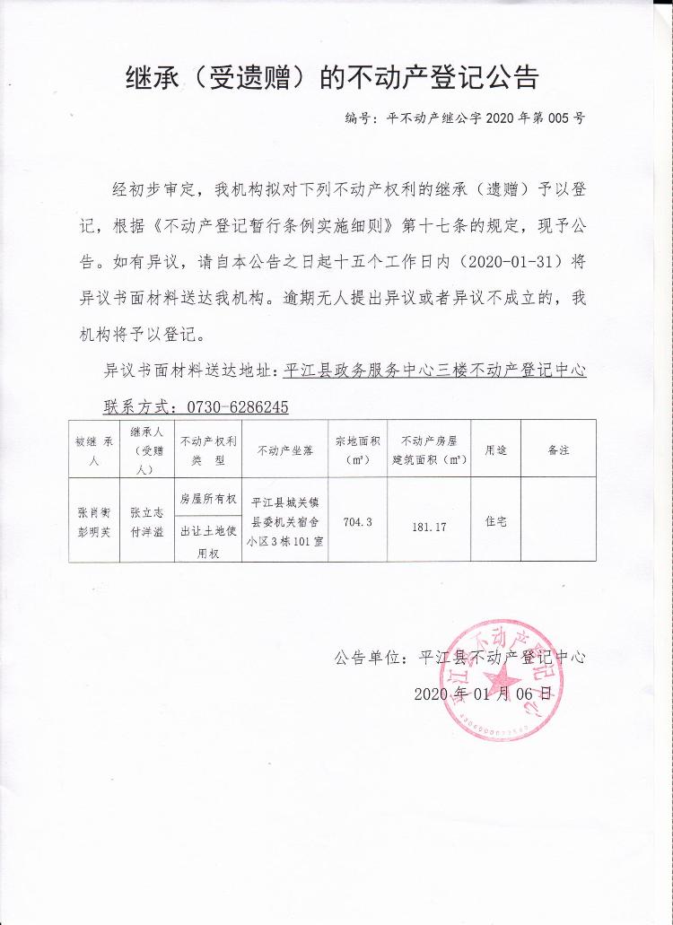 张立志 付洋溢继承(受遗赠)的不动产登记公告