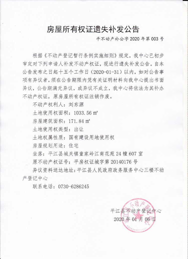 刘东源房产证遗失补发公告