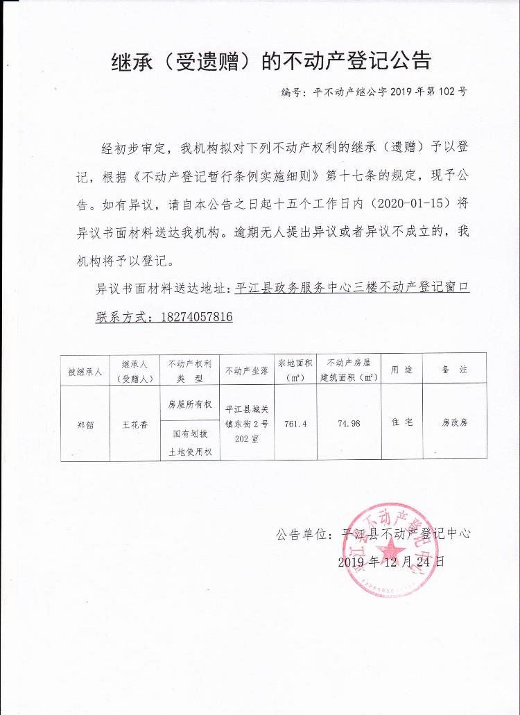 王花香继承(受遗赠)的不动产登记公告平不动产继公字2019年第102号