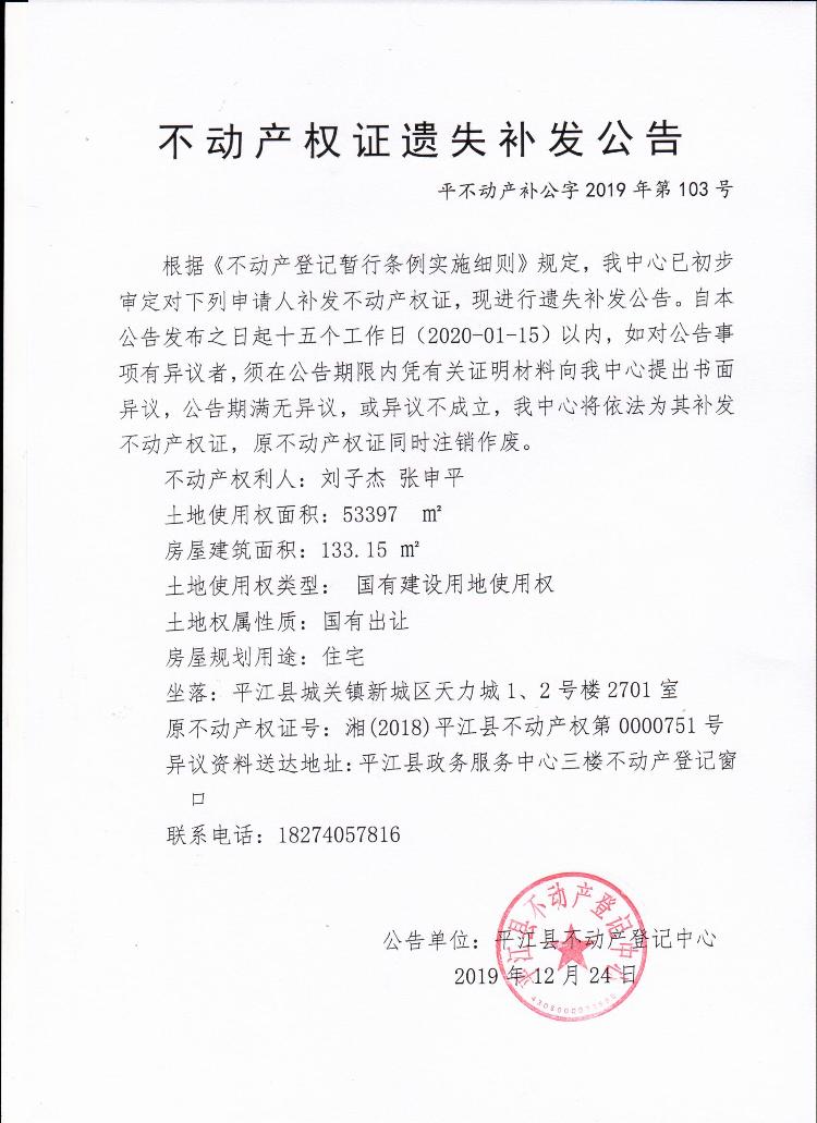 刘子杰 张申平不动产证遗失补发公告平不动产补公字2019年第103号