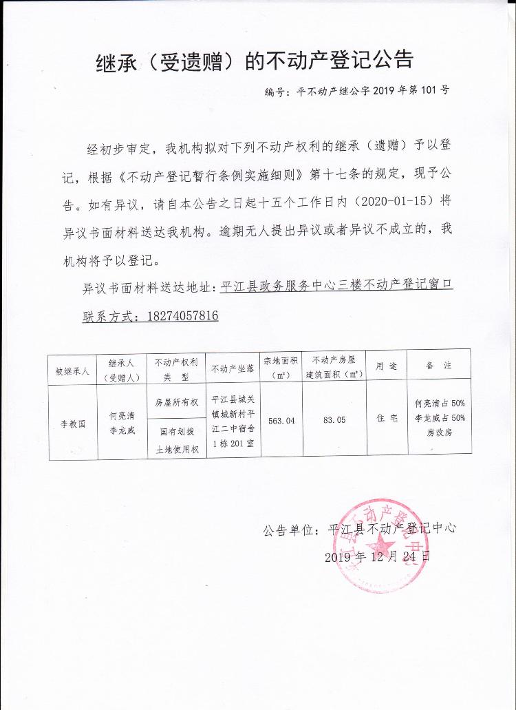 何亮清 李龙威继承(受遗赠)的不动产登记公告平不动产继公字2019年第101号