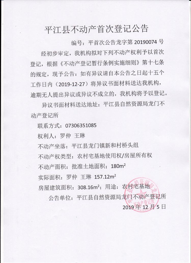 罗仲 王琳平江县不动产首次登记公告